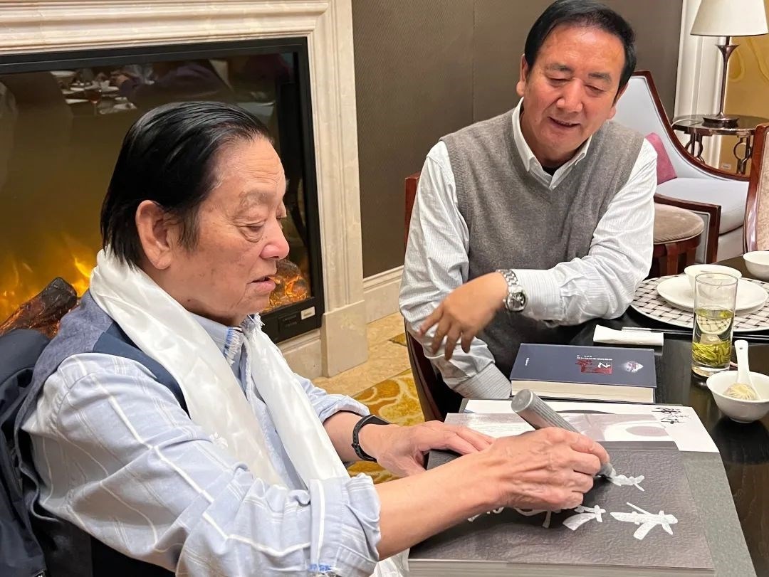 ▲韓美林為原青海省第十二屆人大常委會(huì)黨組副書記,現(xiàn)三江源生態(tài)保護(hù)基金會(huì)理事長鄧本太簽書留念