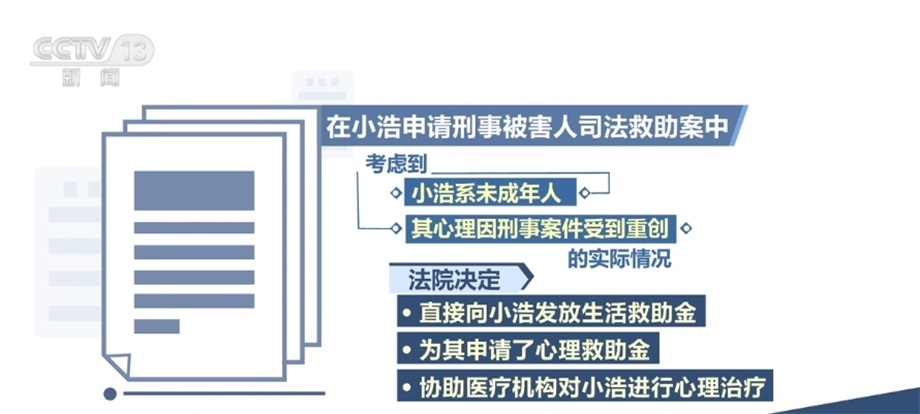 在此次發(fā)布的保護未成年人權益司法救助典型案例中,還涉及針對向未成年人提供專門心理救助金、提供心理危機干預等立體幫扶,進一步延伸司法服務。在小浩申請刑事被害人司法救助案中,小浩的父親被害,其本人亦受到人身傷害,法院作出刑事附帶民事判決,判處被告人死刑,并判決其賠償附帶民事訴訟原告人經(jīng)濟損失13萬余元。后經(jīng)調查,被告人無財產(chǎn)可供執(zhí)行??紤]到小浩系未成年人,其心理因刑事案件受到重創(chuàng)的實際情況,法院除決定直接向小浩發(fā)放生活救助金外,還為其申請了心理救助金,協(xié)助醫(yī)療機構對小浩進行心理治療。
