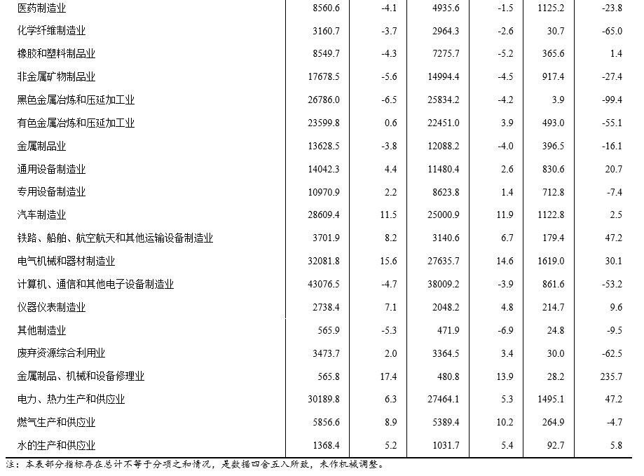 1—4月份,在41個工業(yè)大類行業(yè)中,13個行業(yè)利潤總額同比增長,1個行業(yè)持平,27個行業(yè)下降。主要行業(yè)利潤情況如下:電力、熱力生產(chǎn)和供應業(yè)利潤總額同比增長47.2%,電氣機械和器材制造業(yè)增長30.1%,通用設(shè)備制造業(yè)增長20.7%,汽車制造業(yè)增長2.5%,石油和天然氣開采業(yè)下降6.0%,專用設(shè)備制造業(yè)下降7.4%,煤炭開采和洗選業(yè)下降14.6%,非金屬礦物制品業(yè)下降27.4%,紡織業(yè)下降30.2%,農(nóng)副食品加工業(yè)下降36.3%,計算機、通信和其他電子設(shè)備制造業(yè)下降53.2%,有色金屬冶煉和壓延加工業(yè)下降55.1%,化學原料和化學制品制造業(yè)下降57.3%,石油、煤炭及其他燃料加工業(yè)下降87.9%,黑色金屬冶煉和壓延加工業(yè)下降99.4%。