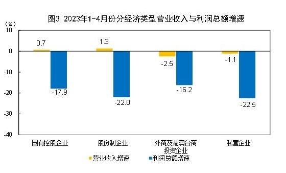 1—4月份,規(guī)模以上工業(yè)企業(yè)中,國有控股企業(yè)實現(xiàn)利潤總額7579.8億元,同比下降17.9%;股份制企業(yè)實現(xiàn)利潤總額14962.4億元,下降22.0%;外商及港澳臺商投資企業(yè)實現(xiàn)利潤總額4679.9億元,下降16.2%;私營企業(yè)實現(xiàn)利潤總額5240.3億元,下降22.5%。