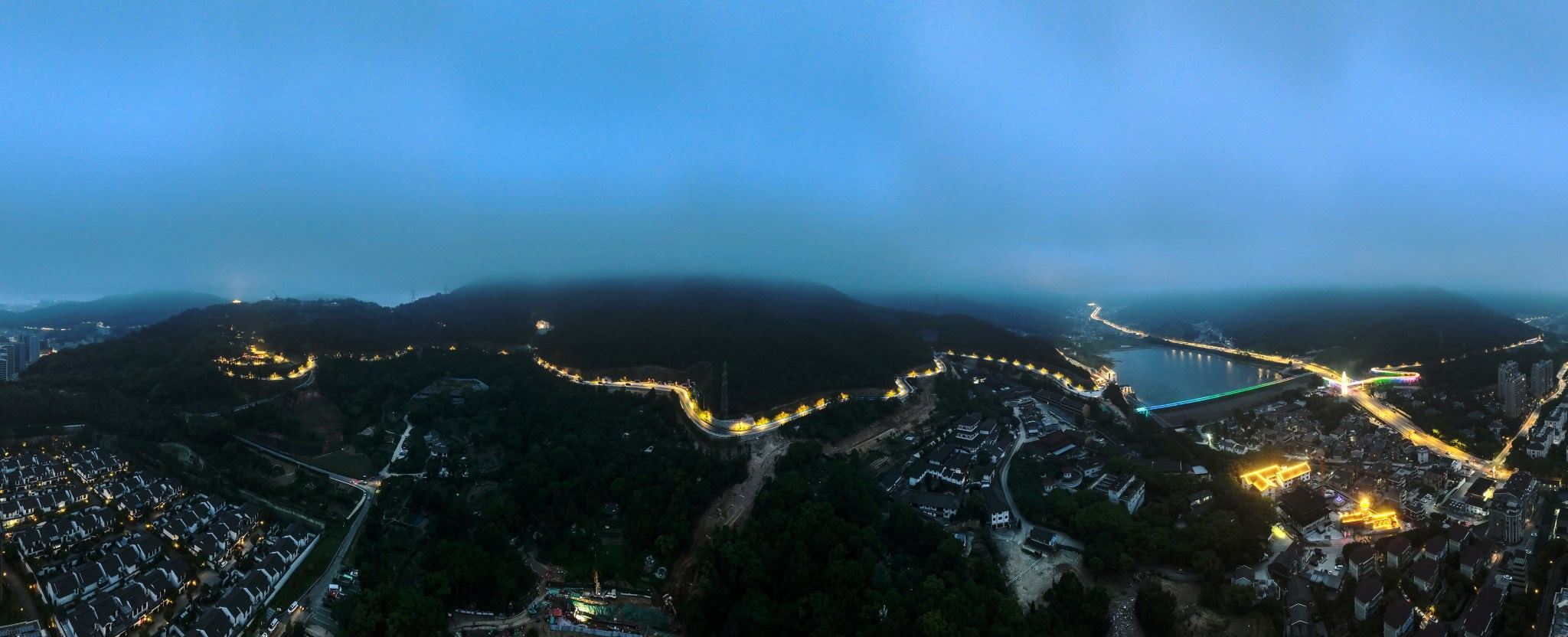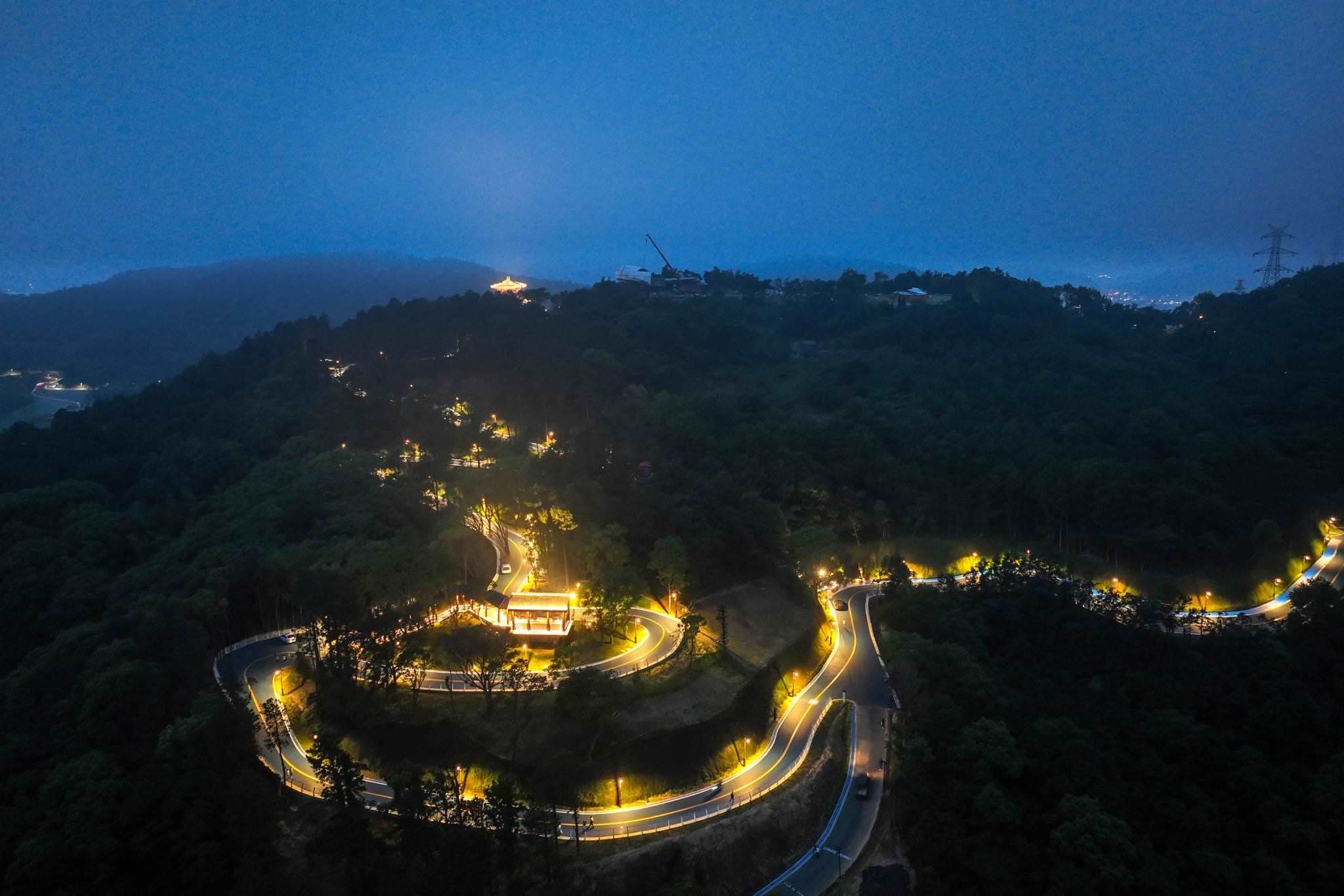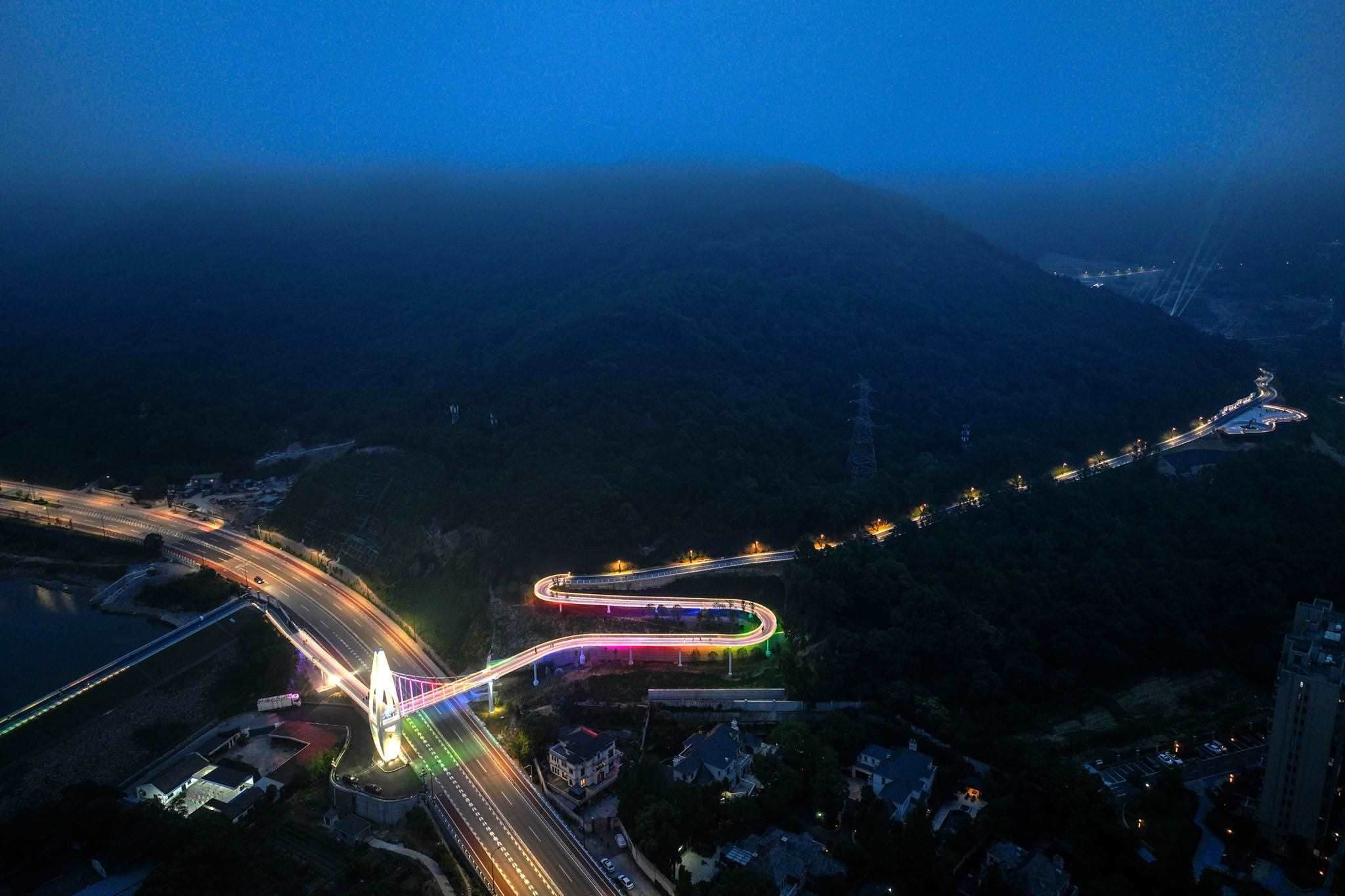 2023年5月26日,浙江舟山,定海區(qū)東海云廊的便道燈準(zhǔn)時(shí)亮起,使這條青山疊翠、美麗磅礴的東海云廊更為靚麗,似蛟龍遨游在蒼翠間。