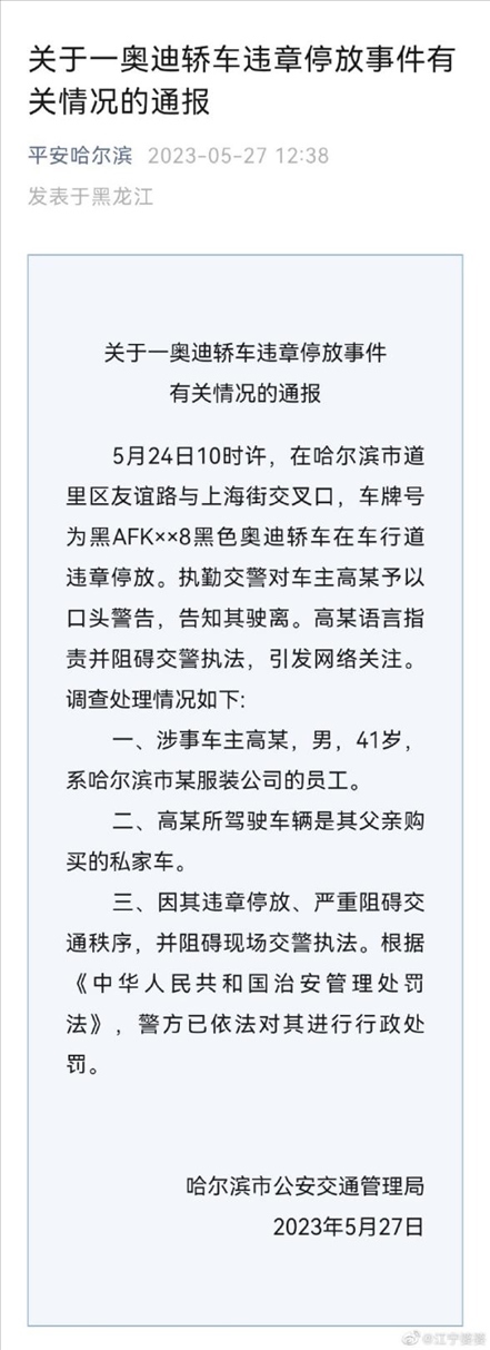 ·哈爾濱警方通報(bào)網(wǎng)傳副市長(zhǎng)違停與交警沖突:涉事車主為服裝公司員工。