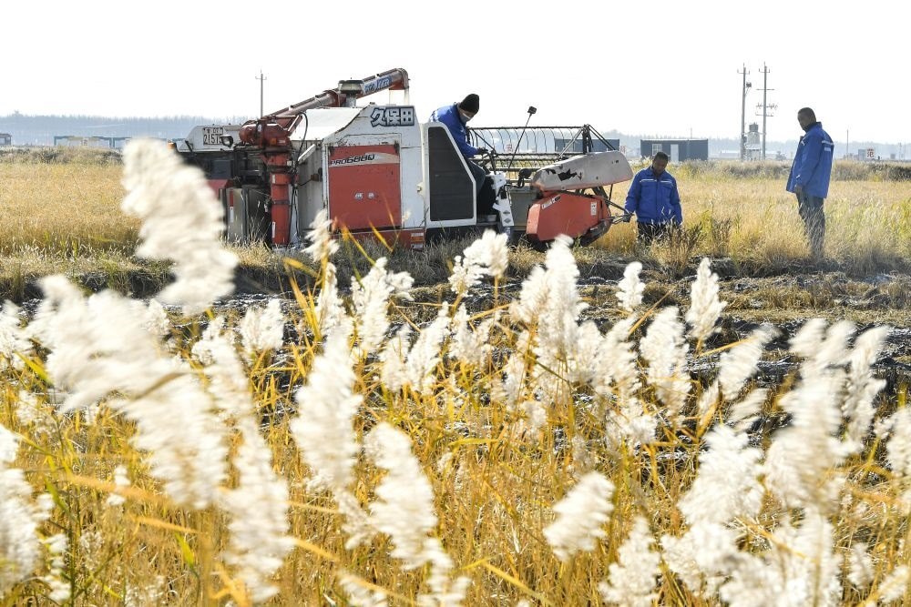 在吉林省大安市海坨鄉(xiāng)鹽堿地生態(tài)修復治理示范基地,農民駕駛收割機收割水稻(2022年10月12日攝)。新華社記者 許暢 攝
