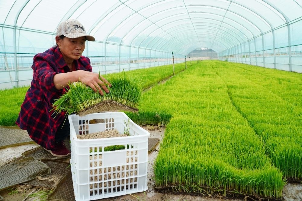 5月20日,山東省東營市墾利區(qū)黃河口鎮(zhèn),農戶在培育海水稻秧苗。新華社記者 徐速繪 攝