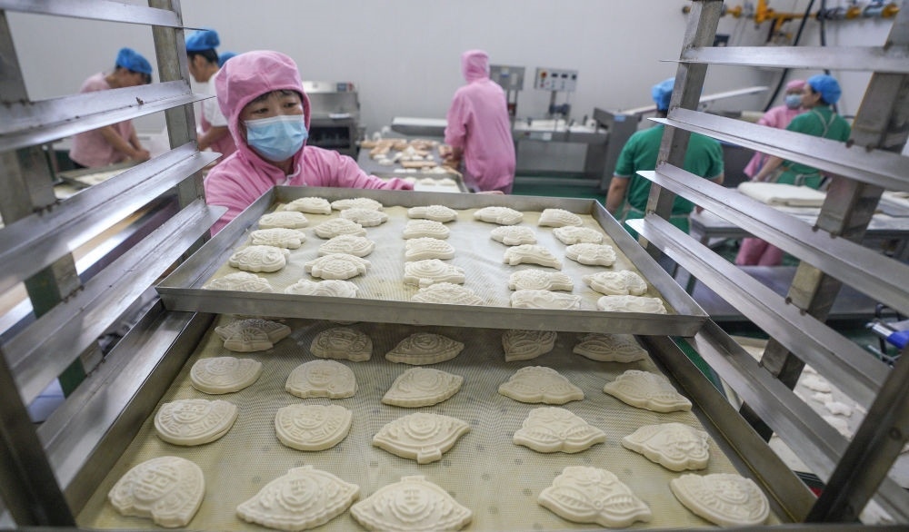 5月23日,工人在滄州渤海新區(qū)黃驊市河北銀海農業(yè)科技有限公司面食生產車間搬運面花。新華社記者 駱學峰 攝