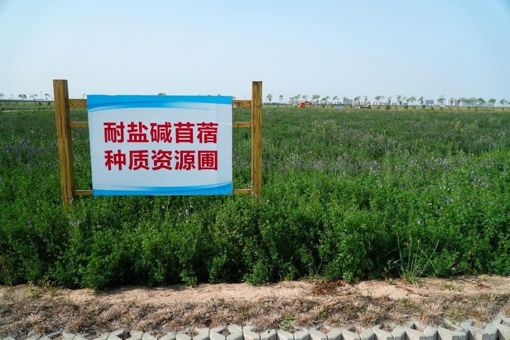 5月19日,位于山東省東營市黃河三角洲農業(yè)高新技術產業(yè)示范區(qū)的耐鹽堿苜蓿種質資源圃。新華社記者 徐速繪 攝