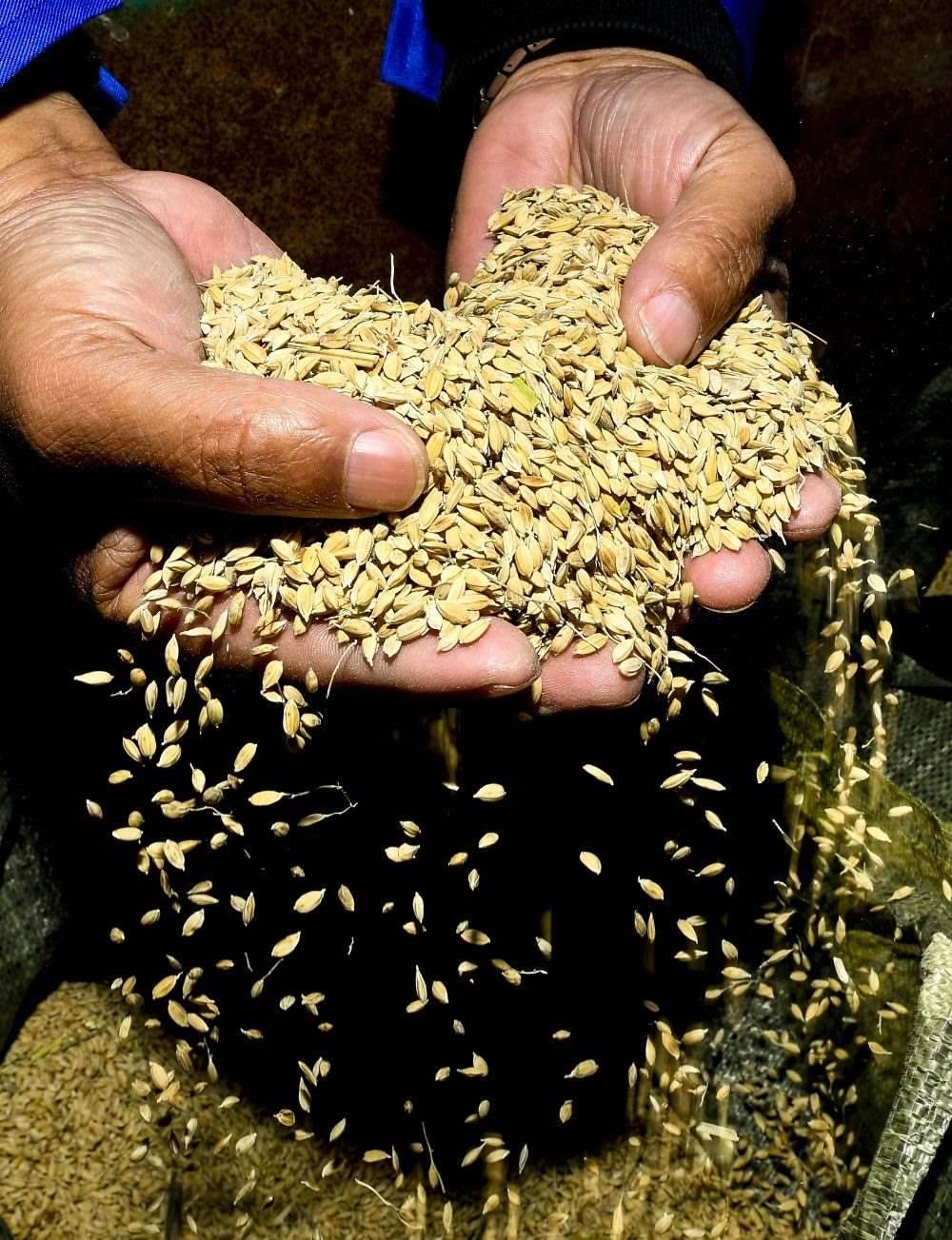 在吉林省大安市海坨鄉(xiāng)鹽堿地生態(tài)修復治理示范基地,農民查看收獲的稻谷(2022年10月12日攝)。新華社記者 許暢 攝