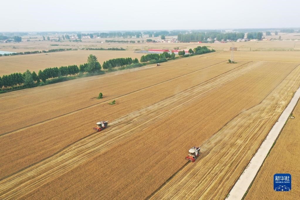 6月1日,在河南省駐馬店市上蔡縣邵店鎮(zhèn)后楊村,收割機(jī)在搶收小麥(無(wú)人機(jī)照片)。新華社記者 張浩然 攝