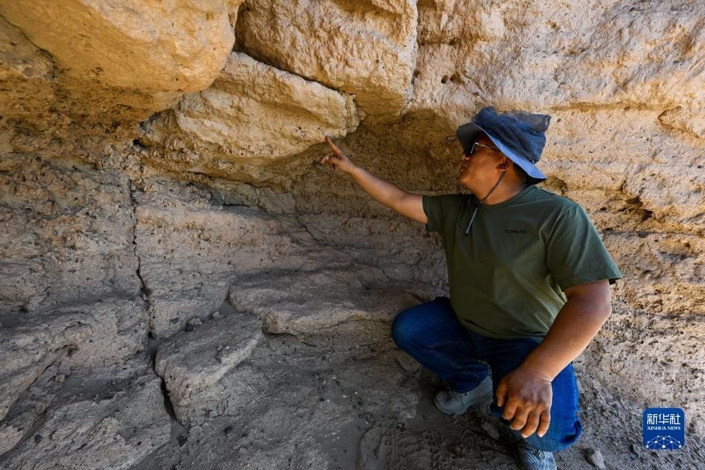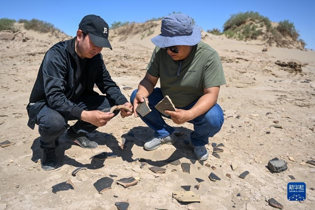 6月2日,額濟(jì)納旗文物保護(hù)中心工作人員在居延遺址附近查看散落的陶片。
