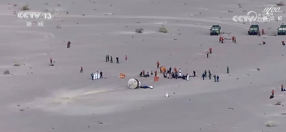 返回艙成功著陸,擔(dān)負(fù)搜救回收任務(wù)的搜救分隊及時發(fā)現(xiàn)目標(biāo)并抵達著陸現(xiàn)場。