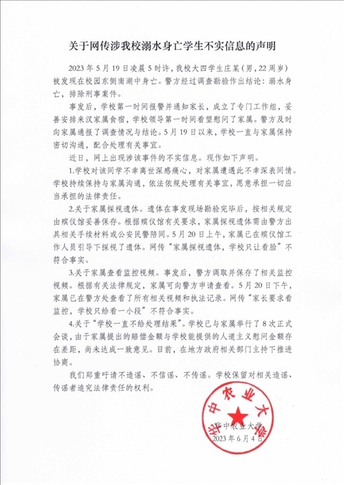 ·學生溺水身亡、不給家長看監(jiān)控視頻?華中農業(yè)大學回應:傳言不實。