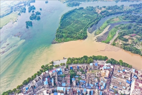 受降雨影響,廣西桂林全州縣城湘江河段出現涇渭分明景觀。空中俯瞰,湘江支流萬鄉(xiāng)河混濁的河水繞城匯入清澈的湘江干流,交匯之處涇渭分明。