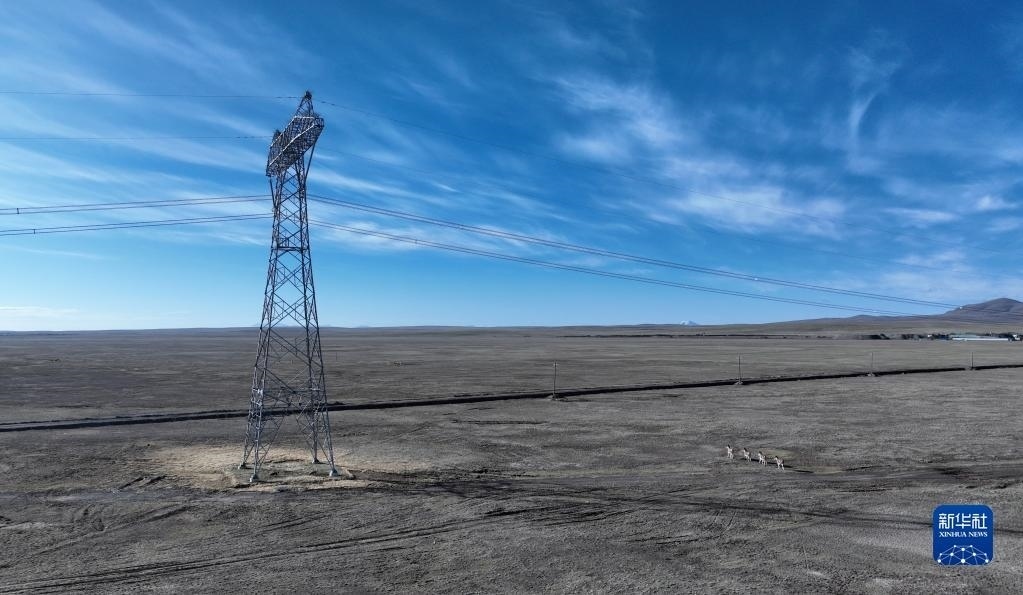 這是在青海可可西里拍攝的青藏聯(lián)網(wǎng)工程一座輸電鐵塔(6月2日攝)。