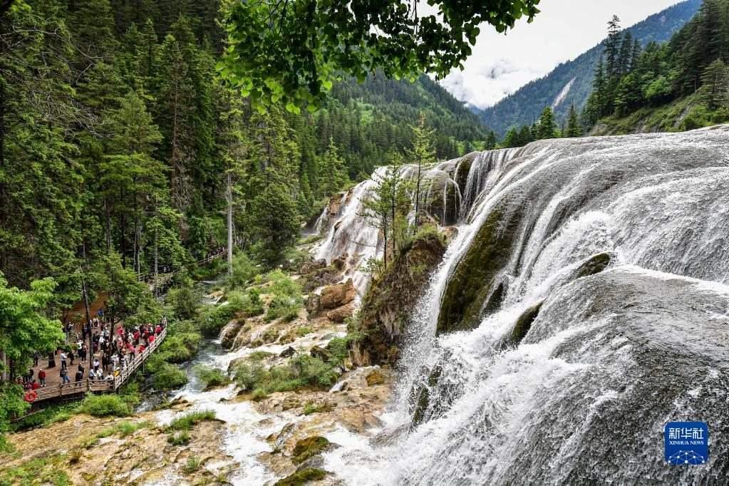 游客在九寨溝景區(qū)珍珠灘瀑布前駐足(6月7日攝)。