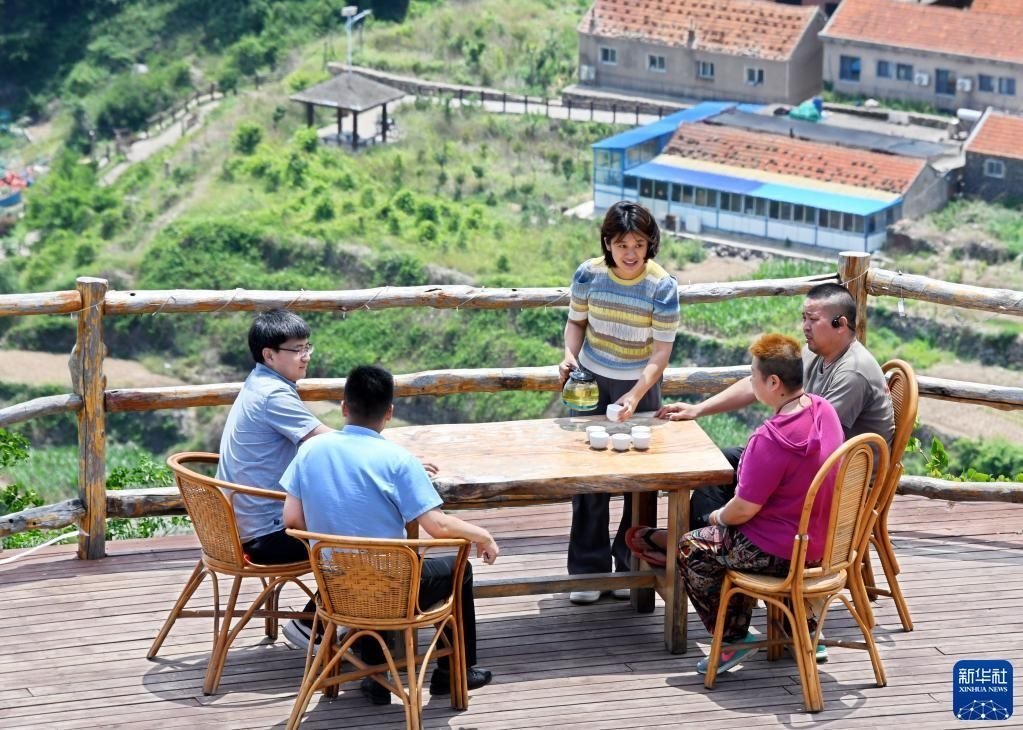 6月5日,游客在靈山島省級(jí)自然保護(hù)區(qū)一民宿飲茶休閑。