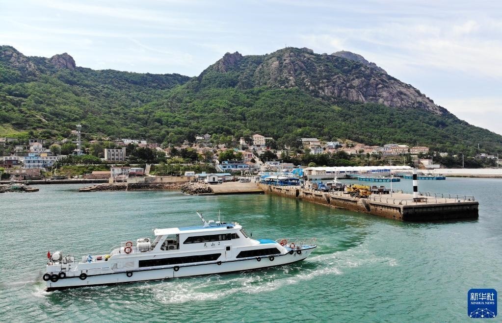 一艘快艇在靈山島省級(jí)自然保護(hù)區(qū)碼頭接送游客(6月5日攝,無人機(jī)照片)。