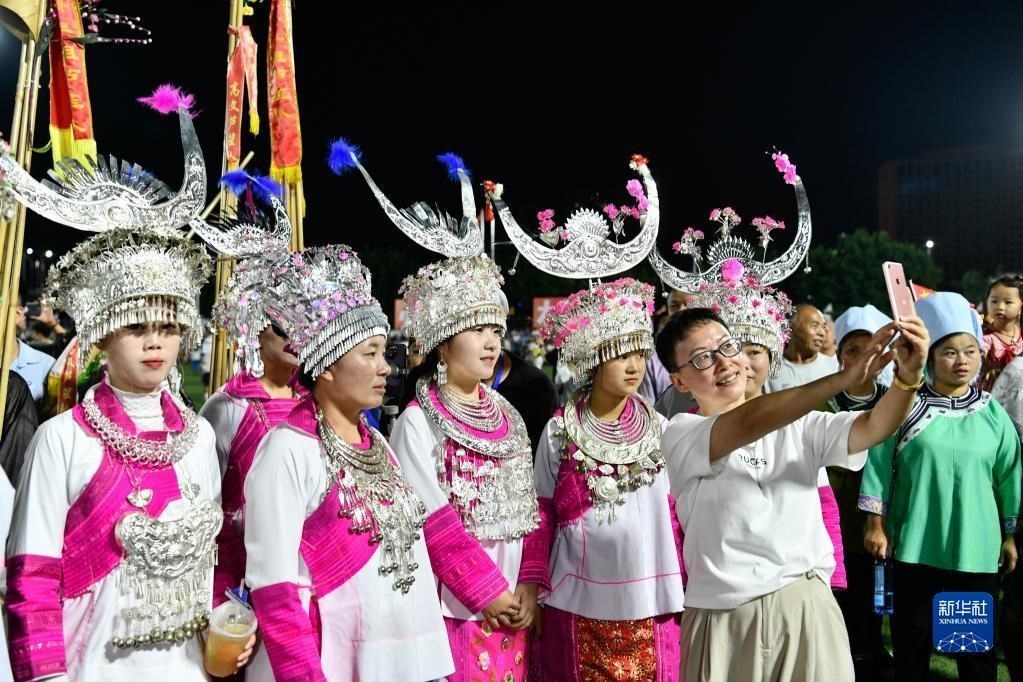 6月9日,一名游客在貴州“村超”足球比賽現(xiàn)場與少數(shù)民族拉拉隊合影。