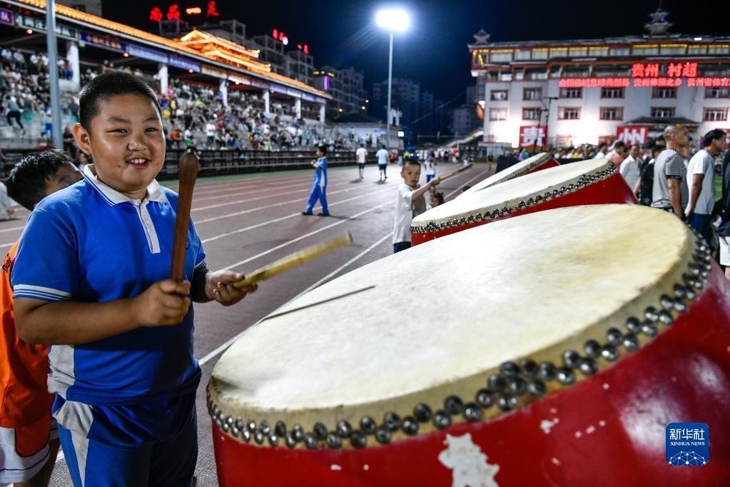 6月9日,一名小朋友在貴州“村超”足球比賽現(xiàn)場擊鼓助威。