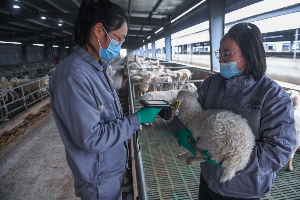 浙江省湖州市長興縣呂山鄉(xiāng)湖羊智慧循環(huán)產(chǎn)業(yè)園的工作人員在掃描湖羊幼仔耳朵上的數(shù)字芯片(2022年1月6日攝)。新華社記者 徐昱 攝