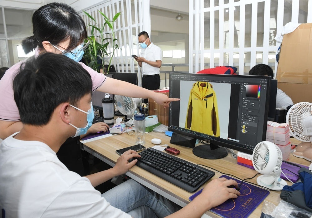 在浙江省臺(tái)州市三門縣的一家戶外用品企業(yè),工作人員在討論一款沖鋒衣的設(shè)計(jì)(2022年6月14日攝)。新華社記者 翁忻旸 攝