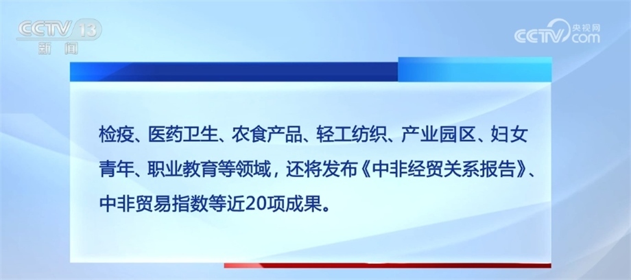 會(huì)期內(nèi)將舉辦開幕式暨中非經(jīng)貿(mào)合作論壇,9場(chǎng)由國(guó)家部委和機(jī)構(gòu)主辦的高端活動(dòng)、7場(chǎng)經(jīng)貿(mào)對(duì)接、3場(chǎng)專題研討和13場(chǎng)地方專場(chǎng)活動(dòng),涵蓋綠色基建、海關(guān)檢疫、醫(yī)藥衛(wèi)生、農(nóng)食產(chǎn)品、輕工紡織、產(chǎn)業(yè)園區(qū)、婦女青年、職業(yè)教育等領(lǐng)域,還將發(fā)布《中非經(jīng)貿(mào)關(guān)系報(bào)告》、中非貿(mào)易指數(shù)等近20項(xiàng)成果。