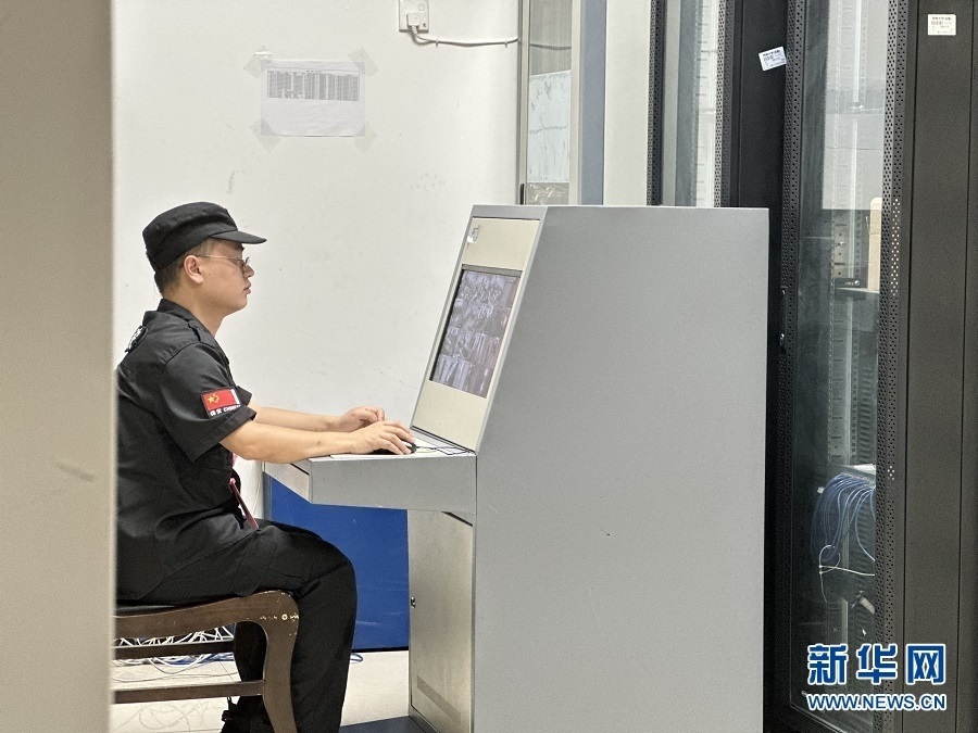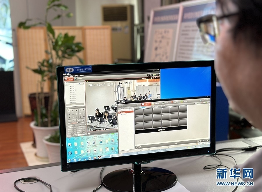 工作人員通過視頻實時監(jiān)控閱卷現(xiàn)場。新華網(wǎng) 彭浩然 攝
