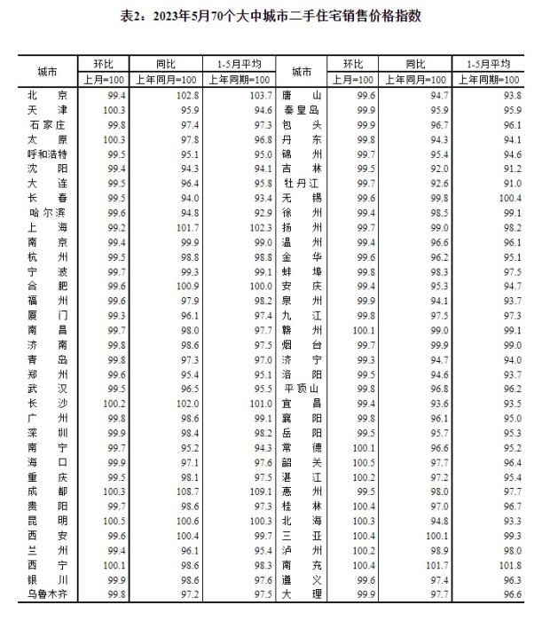2023年5月70個大中城市二手住宅銷售價格指數(shù)。 截圖自國家統(tǒng)計局官網(wǎng)