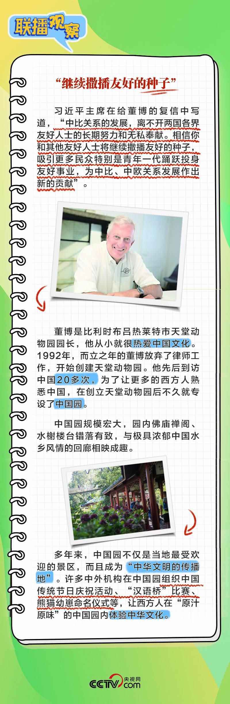 董博是比利時(shí)布呂熱萊特市天堂動(dòng)物園園長(zhǎng),他在給習(xí)主席致信中回顧了習(xí)主席和夫人彭麗媛2014年3月訪比期間出席天堂動(dòng)物園大熊貓園開園儀式的情景,表示中國園體現(xiàn)人與自然和諧共生理念,中國夢(mèng)和中國的發(fā)展繁榮永遠(yuǎn)是可共享的機(jī)遇。