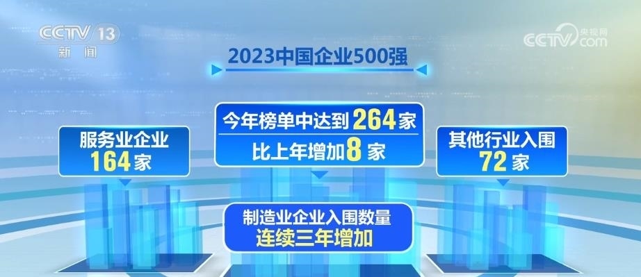 9月20日,中國企業(yè)聯(lián)合會(huì)發(fā)布了“2023中國企業(yè)500強(qiáng)”榜單。2023中國企業(yè)500強(qiáng)中,制造業(yè)企業(yè)入圍數(shù)量連續(xù)三年增加,2023年榜單中達(dá)到264家,比上年增加8家,服務(wù)業(yè)企業(yè)164家,其他行業(yè)入圍72家。從換榜情況來看,有48家新入圍或重新入圍企業(yè),這些企業(yè)中,制造業(yè)有28家,占比58.33%。