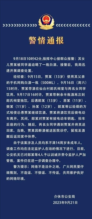 ·13歲女孩被4名未成年人逼喝白酒?山西介休警方通報:4人被訓誡。