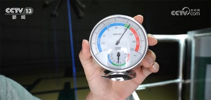 我現(xiàn)在是在氣膜倉的頂部,此刻倉外的溫度是30℃左右,我們再到倉內(nèi)看一下。一進(jìn)來就感覺倉里邊一股涼氣襲人,我們來看這個溫度計上顯示此刻的溫度大概是在22℃,也就是說倉內(nèi)外的溫差有8℃左右,保溫性能還是非常明顯的。