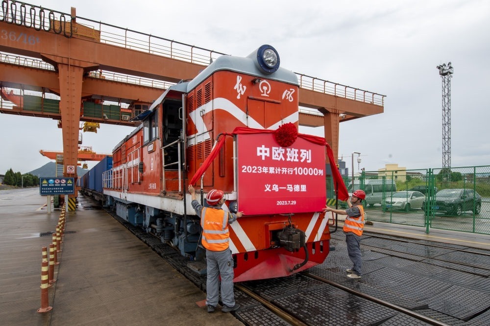 ↑2023年7月29日,滿載110個(gè)標(biāo)箱出口貨物的X8020次中歐班列從鐵路義烏西站準(zhǔn)備啟程。