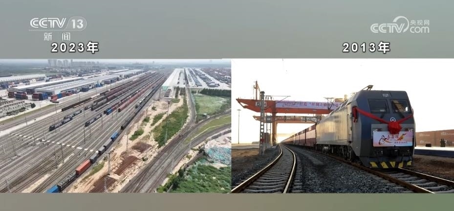 幾百輛剛出廠的新能源汽車整齊地排列在站臺上陸續(xù)裝箱,馬上它們將乘坐中歐班列“長安號”前往中亞。2023年是“一帶一路”倡議提出10周年,也是中歐班列“長安號”開行10周年。每天都有數(shù)以億計的貨物在這里集散。