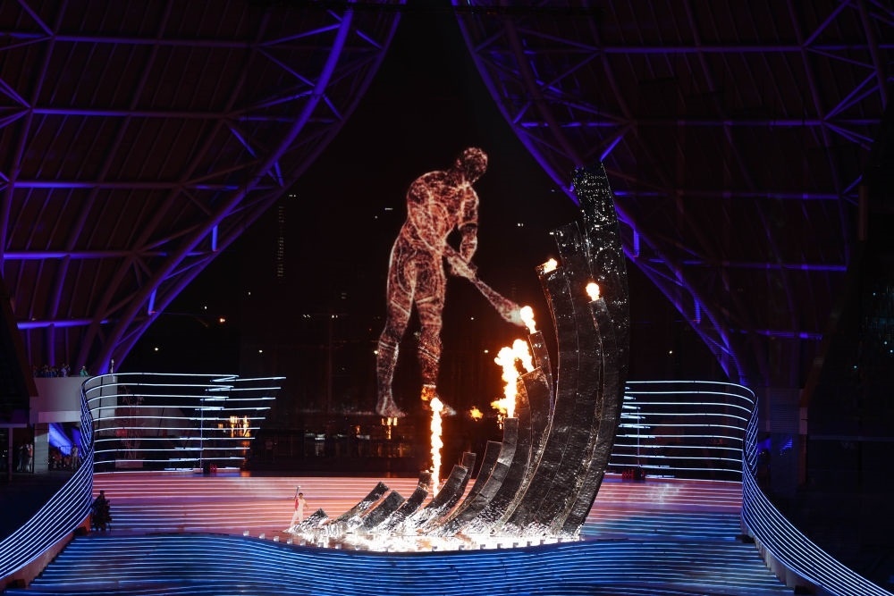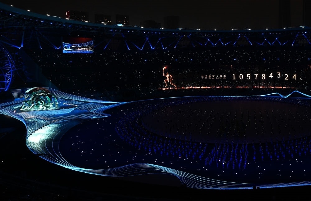 中國農(nóng)歷秋分節(jié)氣,杭州奧體中心體育場“大蓮花”燈光璀璨,萬涓成水,奔涌成潮。“數(shù)字火炬手”與游泳運動員汪順共同點燃了象征亞洲大團(tuán)結(jié)的體育之火,杭州第十九屆亞運會開幕。