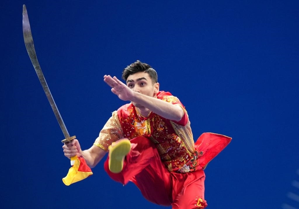 9月27日,伊朗選手侯賽因·蓋卜萊納邁·穆加達姆在刀術(shù)比賽中。當(dāng)日,杭州亞運會武術(shù)男子刀術(shù)棍術(shù)全能決賽在杭州蕭山瓜瀝文化體育中心舉行。新華社記者 李一博 攝