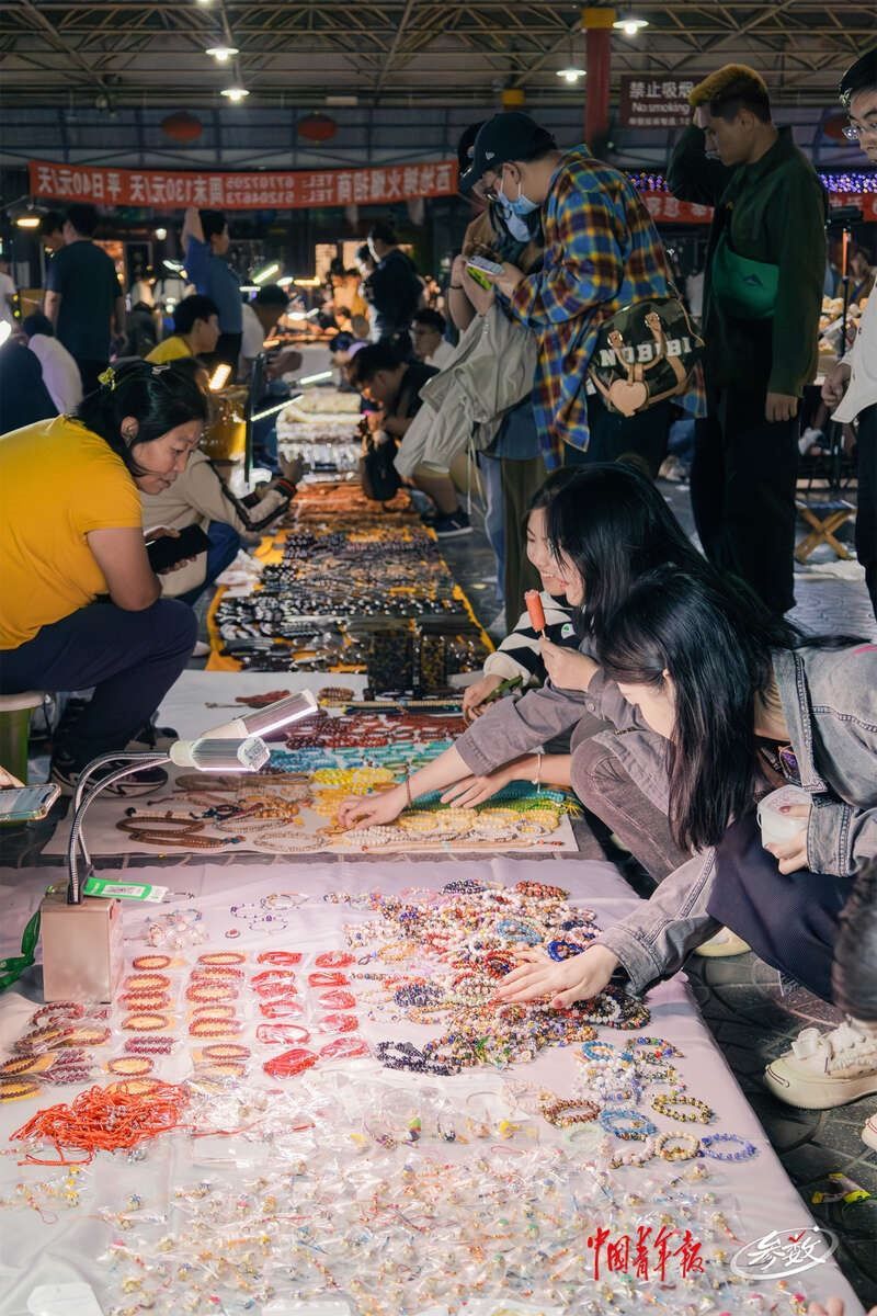 夜幕降臨,北京潘家園舊貨市場(chǎng)內(nèi)的周三夜場(chǎng)開啟,攤位上亮起了一盞盞照明的小燈,很多年輕人正在攤位前選購(gòu)商品。實(shí)習(xí)生 邱嵐/攝