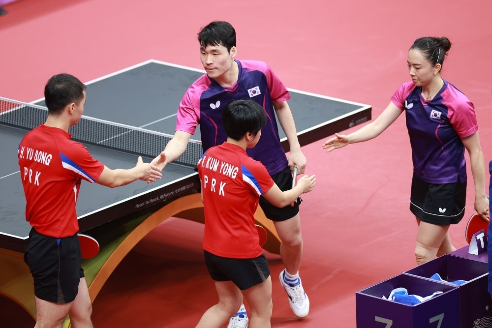 9月28日,韓國(guó)組合張禹珍/田志希與朝鮮組合咸柔成/金金鷹在乒乓球混合雙打八分之一決賽后握手致意。