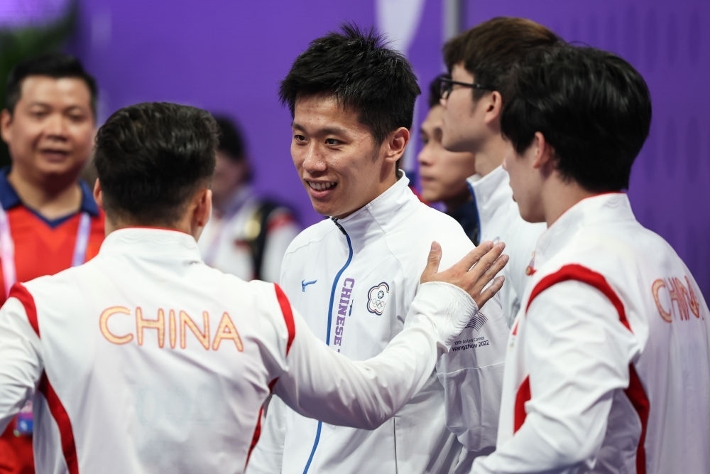 9月28日,中國(guó)臺(tái)北選手李智凱(中)和中國(guó)隊(duì)選手在體操鞍馬決賽中互致問(wèn)候。