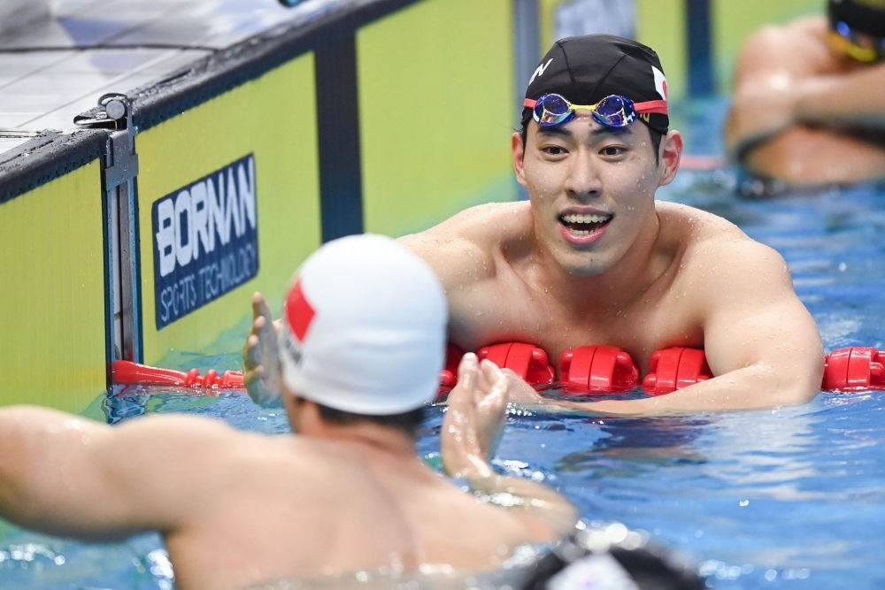 9月26日,本多燈(右)在男子400米個(gè)人混合泳決賽后與中國(guó)選手汪順握手致意。