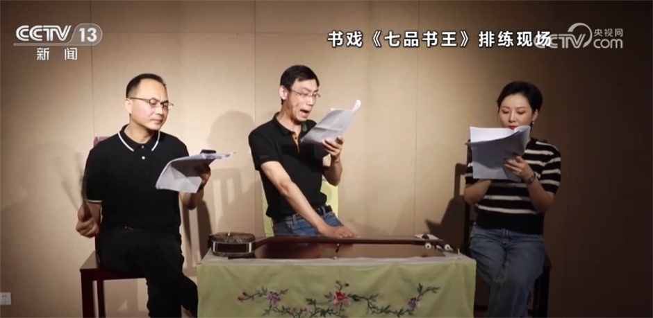 臺上正在排練的書戲叫《七品書王》,講述的是一名說書藝人王周士為乾隆皇帝表演,獲封七品書王,并且成立評彈藝人行會(huì)組織光裕公所的故事。蘇州市評彈團(tuán)將這個(gè)傳統(tǒng)中篇彈詞創(chuàng)新性改編為書戲,不僅在表演人數(shù)、形式、內(nèi)容上都有所創(chuàng)新,劇本中還融入了現(xiàn)代詞匯,觀賞性更強(qiáng)。