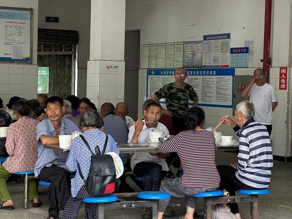 長灘初級(jí)中學(xué)安置點(diǎn)群眾正在用午飯。新華社記者李曉婷 攝