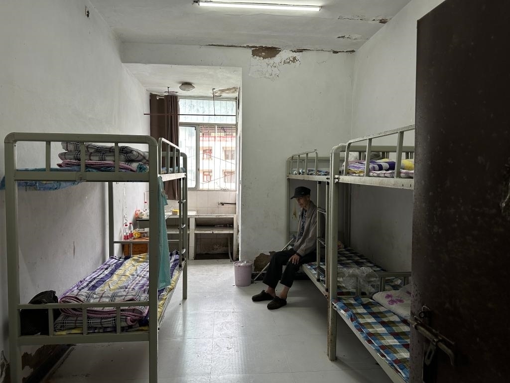 太白西村4組村民譚建和老爺爺行動(dòng)不便,坐在鋪著干凈格子床單的宿舍床上望向窗外?!扒疤煜挛纾鐓^(qū)的車來接的我和老伴,安置點(diǎn)吃喝都好,宿舍住起來也挺舒服。兒子們擔(dān)心我,他們過不來,一天就打好幾通電話,我說都好著呢、好著呢?!弊T爺爺說。
