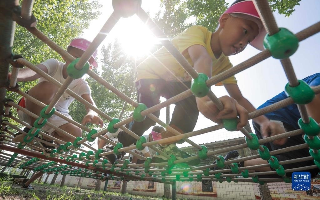 7月8日,參加少年夏令營的孩子在河北省遵化市小廠鄉(xiāng)的訓練營地進行穿越障礙訓練。