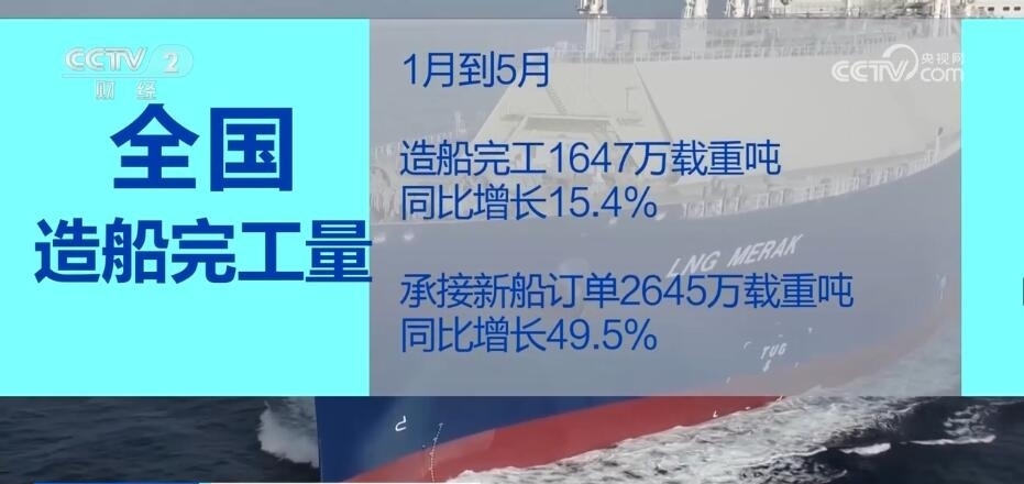 今年1—5月,全國造船完工1647萬載重噸,同比增長15.4%;承接新船訂單2645萬載重噸,同比增長49.5%。5月底,手持船舶訂單11799萬載重噸,同比增長15.5%。綠色船舶理念正逐步貫穿船舶的設(shè)計建造全過程,成為中國造船業(yè)一張響亮的“名片”。