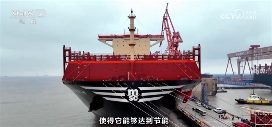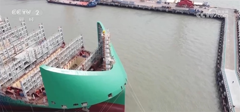 總臺(tái)央視記者 孟湛東:我現(xiàn)在是在中國(guó)船舶滬東中華造船廠的一艘13000箱的雙燃料集裝箱船上。這艘船除了使用傳統(tǒng)的石油燃料之外,還引入了液化天然氣,可以直接降低28%以上的溫室氣體排放。除此之外,在船頭還有一個(gè)獨(dú)特的設(shè)計(jì),各位可以看到一個(gè)綠色的防風(fēng)罩,工人們親切地稱它“綠頭怪”,這樣的設(shè)計(jì)可以讓船舶在正常行駛當(dāng)中降低2%左右的燃料消耗。