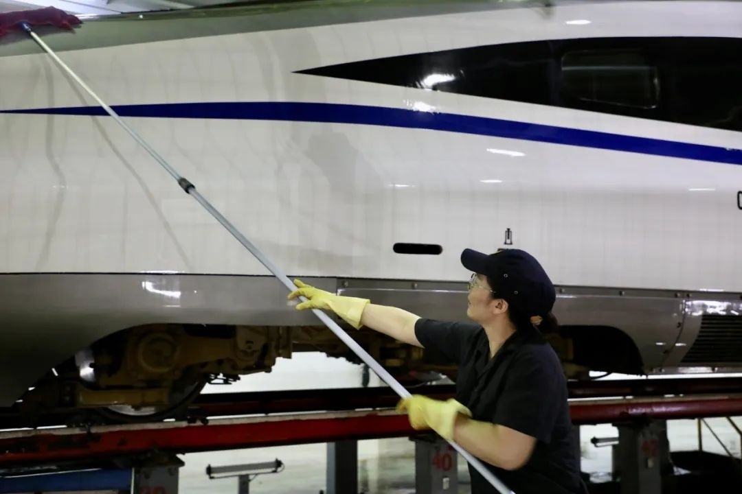 經(jīng)過自動清洗的動車組在開進動車所檢修庫后,將由洗車人員進行深度清潔。20多名洗車人員分工協(xié)作對動車組車頂、車身等各部位進行清洗。