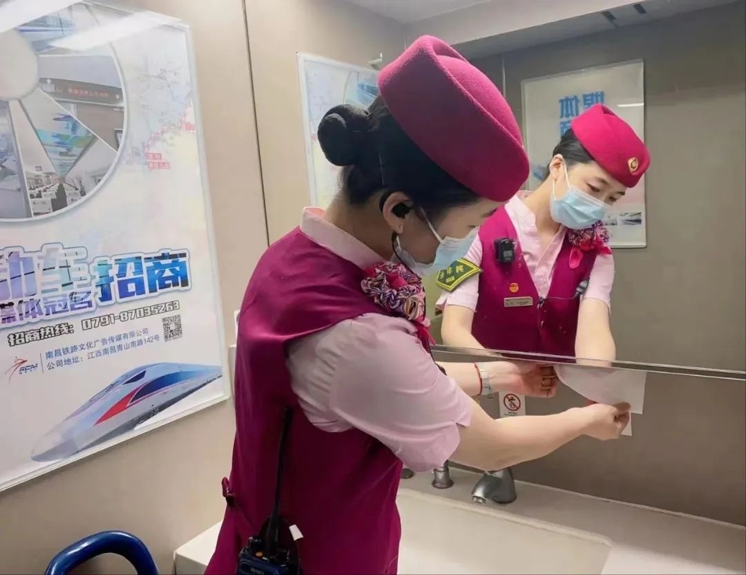 除了車身硬件的“美妝”,在列車上線始發(fā)前,列車乘務人員還要檢查各類客運服務備品、衛(wèi)生備品等是否準備齊全。他們需要保證車座椅背后網(wǎng)兜清潔袋擺放整齊,小桌板統(tǒng)一收起,頭枕巾和椅套擺放平整、干凈、無污染。