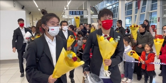 “鏗鏘玫瑰,中國加油!”當(dāng)中國隊球員走入國際到達(dá)大廳后,人群中發(fā)出整齊的助威聲。球迷們、孩子們紛紛把鮮花送給隊員們,有的與她們合影留念。當(dāng)看到主教練水慶霞走過來,大家非常熱情,把水指導(dǎo)圍在中間,送上鮮花,致以問候。