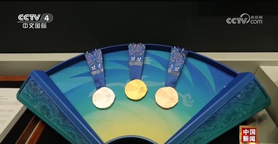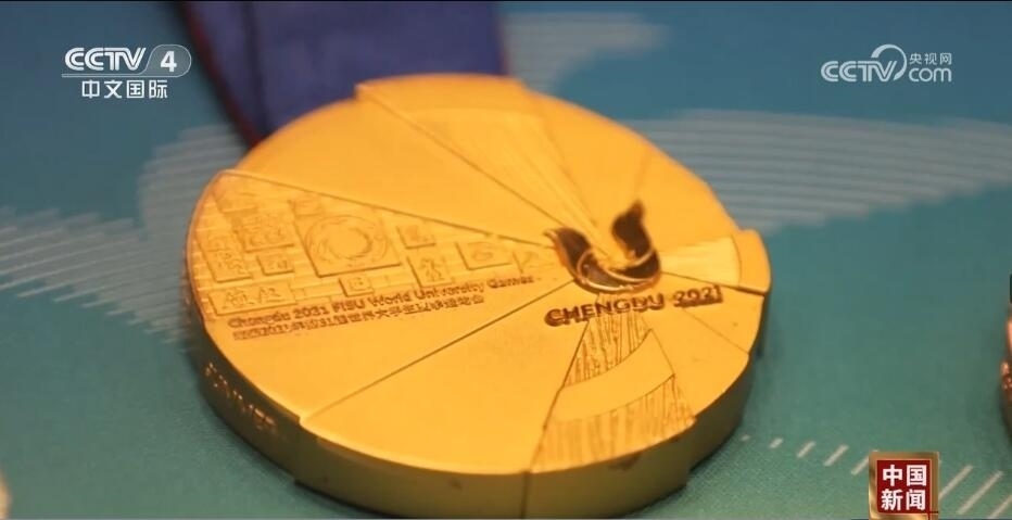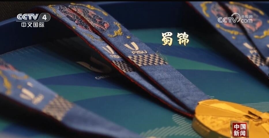 總臺記者 王豐:走進成都大運會博物館,最大的感受就是成都的元素?zé)o處不在。比如,我們剛一進來,右手邊是成都大運會的吉祥物蓉寶。看完蓉寶帶您來看看蓉光,什么是蓉光呢?獎牌代表了成都大運會的榮譽,“蓉”是取自成都的簡稱,包含了光榮和融合的含義,整個獎牌的設(shè)計是呈現(xiàn)了不規(guī)則的圓形。另外,獎牌的元素包含成都市的標(biāo)志——太陽神鳥。此外,在獎牌的綬帶設(shè)計上首次采用了蜀錦的制作工藝,實際上也是非物質(zhì)文化遺產(chǎn)活化利用的非常好的案例。