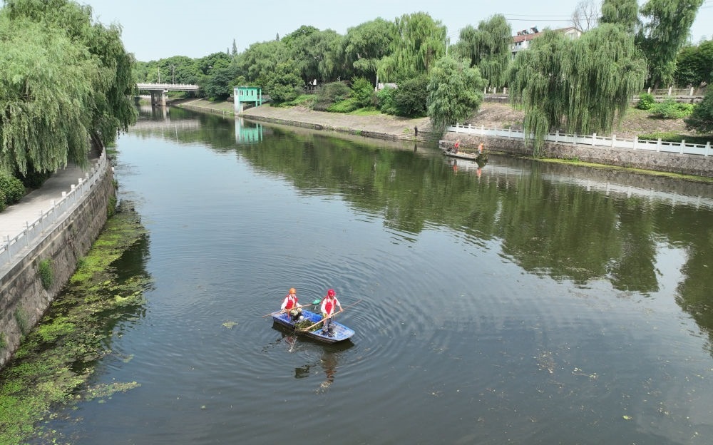 工作人員在湖州市吳興區(qū)埭溪鎮(zhèn)進行河道保潔(6月21日攝,無人機照片)。新華社記者 翁忻旸 攝